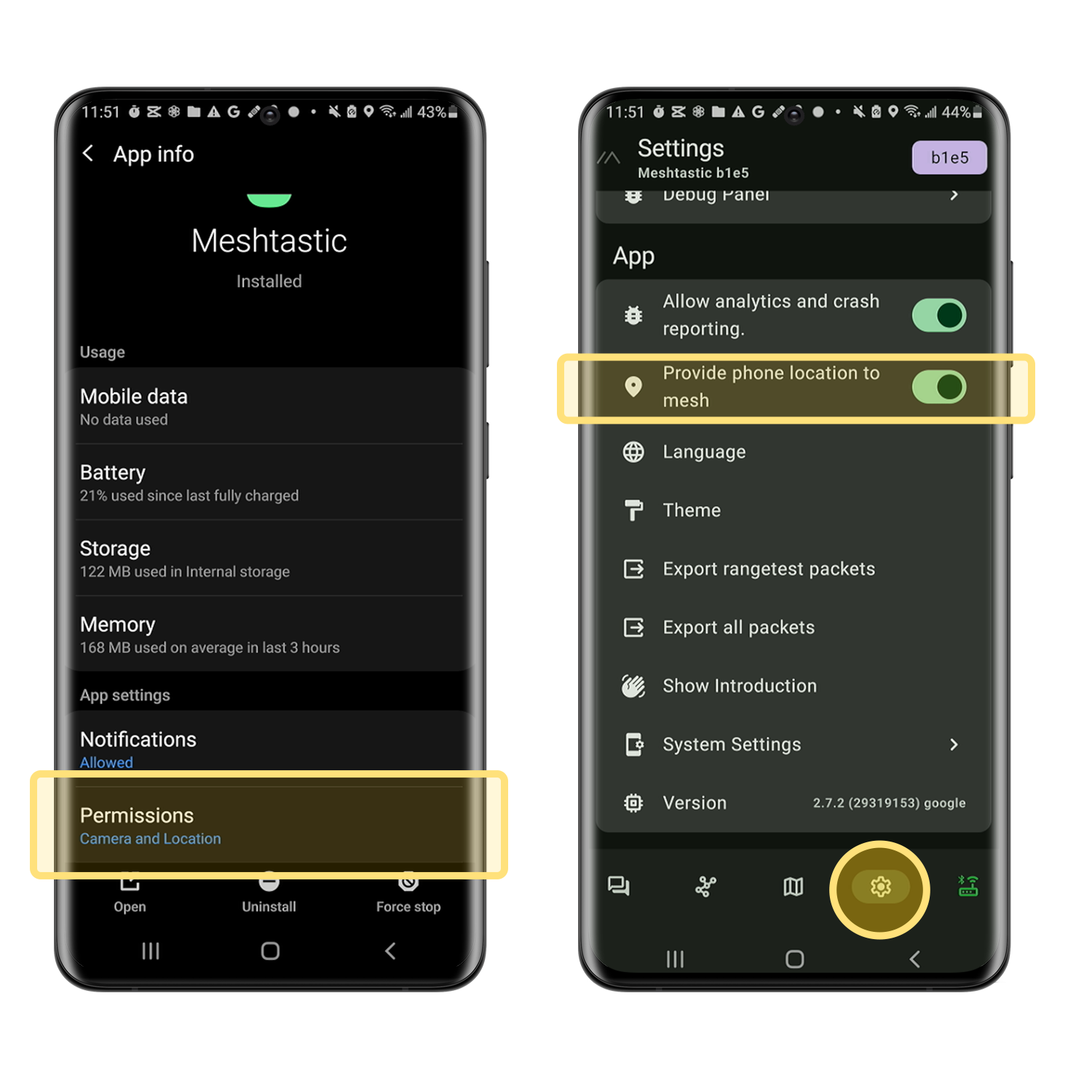 - Open the Meshtastic app, tap the Gear icon > App > enable Provide phone location to mesh.
