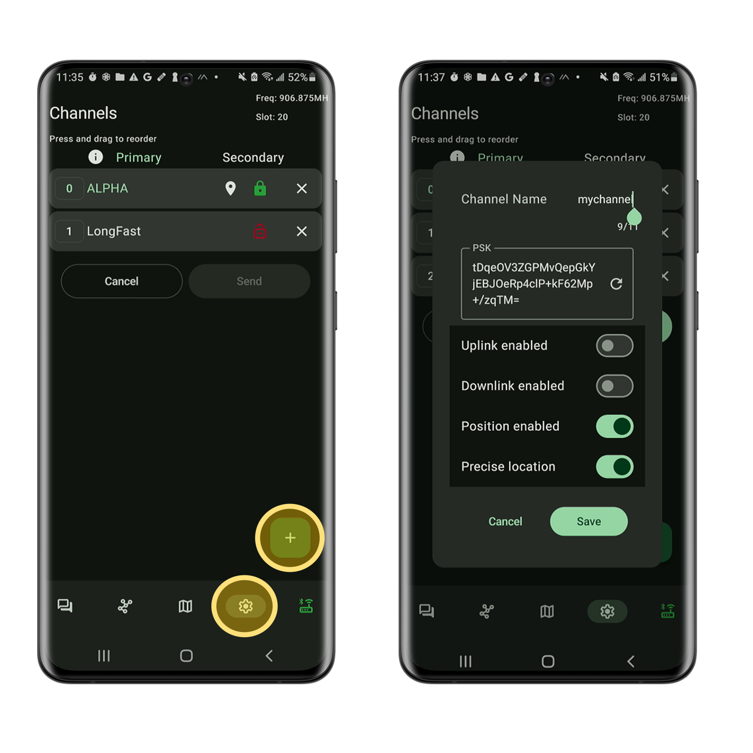- In the Settings tab > Radio configuration > Channels, tap the + icon.